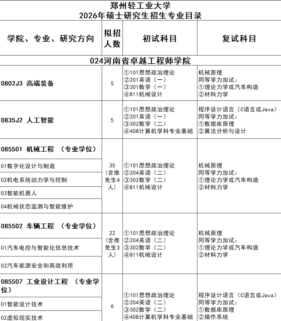 郑州轻工业大学河南省卓越工程师学院2026年硕士研究生招生专业目录