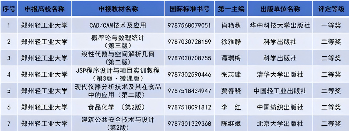 近日,河南省教育厅办公室发布了《关于公布河南省教材等级评定结果的通知》,评选出全省高等教育类优秀教材147项,我校推荐申报的《CAD/CAM技术及应用》等7部教材喜获高等教育类优秀教材奖,其中河南省卓越工程师学院肖艳秋教授主编的《CAD/CAM技术及应用》荣获一等奖。